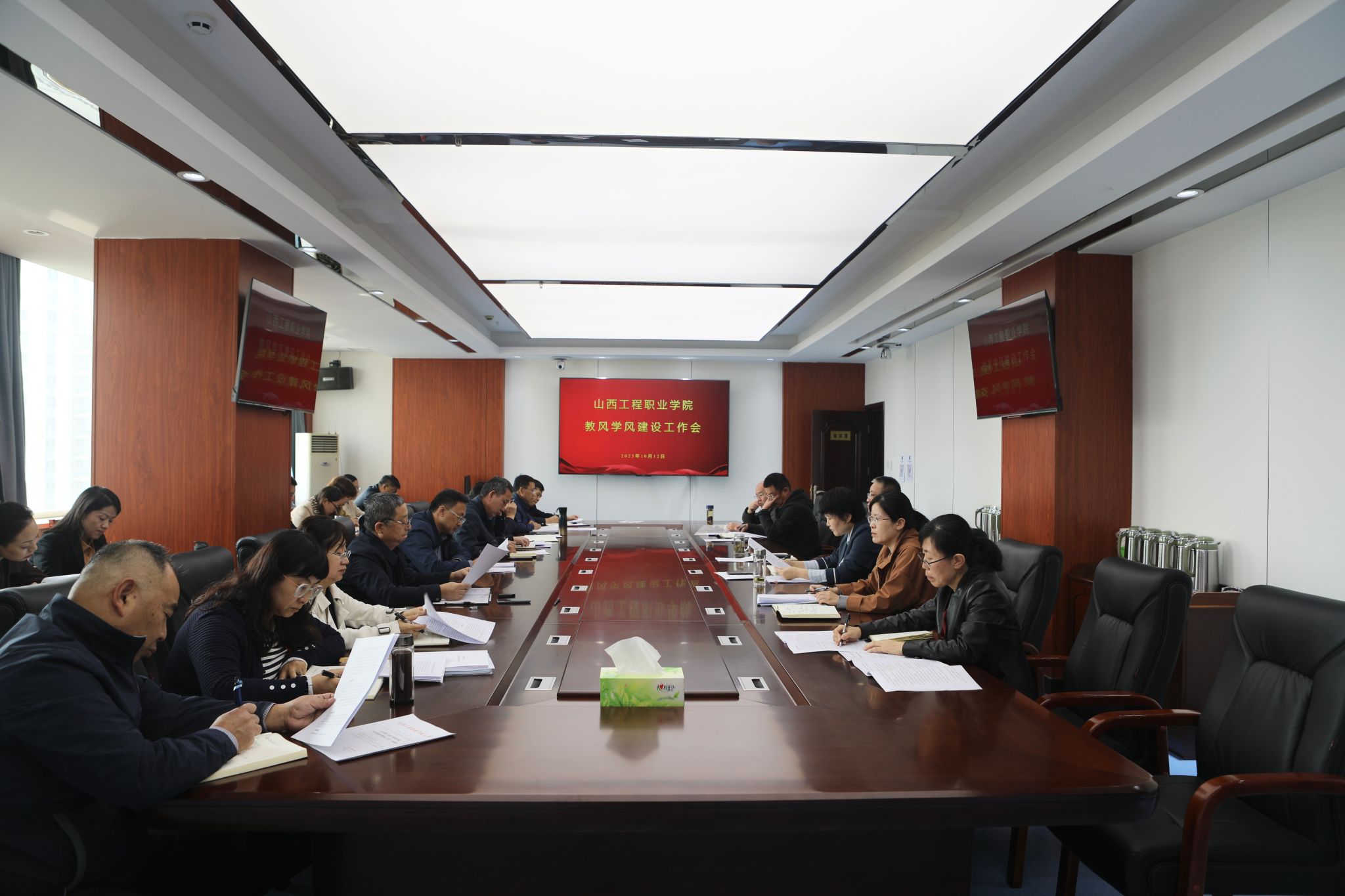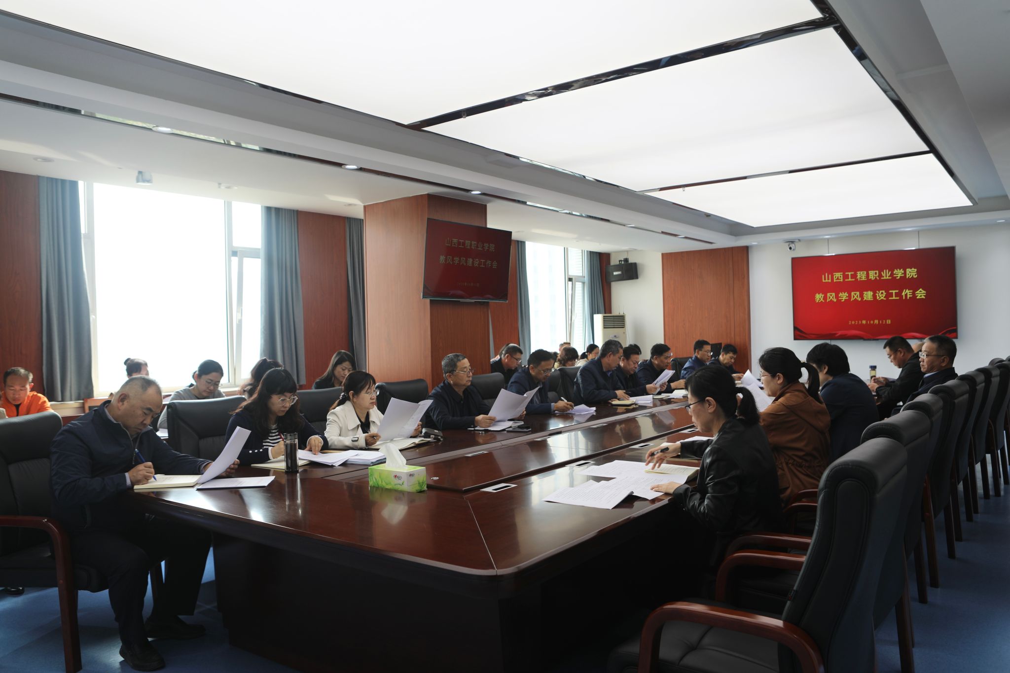 会上,教务部副部长王宇剖析了目前学院教学工作中存在的问题,提出在此背景下开展以“回归教学、回归课堂、回归本分、回归初心”为基本遵循的教风建设工作。随后解读了《山西工程职业学院教风建设实施方案》,提出加强师德师风建设、规范教学过程、加强教学质量监控、实施“青蓝领航”工程等方面的实施举措。学工部部长吴靖龙明确了学风建设中学工部和各系部的责任分工,并从思想引领、制度落实、榜样示范、文明养成等方面详细介绍了学风建设实施方案。人事部部长张会娟对教风建设中有关教师培养工作进行了安排。办学质量评估中心主任吕增芳对近期教学督导进行了总结,指出目前存在的问题,并提出了下一步的改进措施。团委书记许风虎从思想引领、加强第二课堂与第一课堂的结合等方面,提出加强学风建设的实施举措。