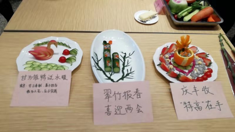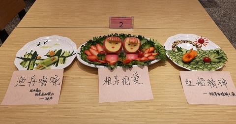 比赛开始,整个赛场就呈现出一片繁忙的景象。各组选手团结协作,分工明确,她们有的娴熟的运用手中的小刀,对食料进行削皮、切割、雕刻,有的充分发挥自己的想象力,用加工好的食料摆放各种造型。在经过将近一个小时的比赛,一阵阵欢声笑语之后,一盘盘造型精美、色彩艳丽的冷菜拼盘就“新鲜出炉”了。“红船精神”、“党旗引领”、“改革创新”、“特高节节高”、“和谐交通”、“扬帆远航”、“繁荣富强”等,各式的拼盘无论从构思到造型设计再到作品名都独具匠心,令人耳目一新,让人眼前一亮。