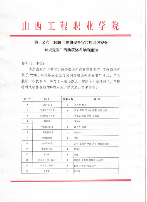 网络安全知识竞赛活动获奖名单的通知