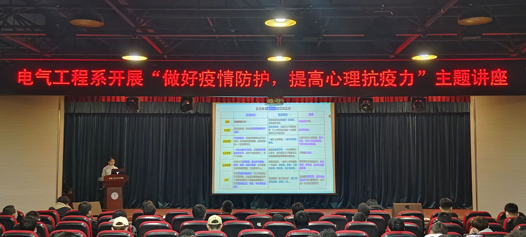 11月25日,电气工程系在院图书馆8层报告厅举办“做好疫情防护,提高心理抗疫力”的疫情防控主题讲座,系团总支书记纪郑瑜主持,王晓丽老师宣讲,全体辅导员和50名学生代表现场参加,其余师生线上同步收看。