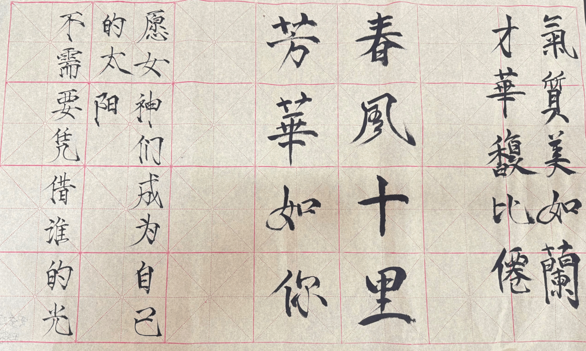 除此之外,通过举办“书法活动”让同学们在一字一世界,一笔一乾坤之间感受巾帼英雄的风采。同学们凝心聚神,起笔落笔,横竖撇捺,享受书写乐趣,领略汉字风韵,深入体悟中华优秀传统文化的博大精深。写好字做好人,文化自信立心间,字字绽放“她”精彩!