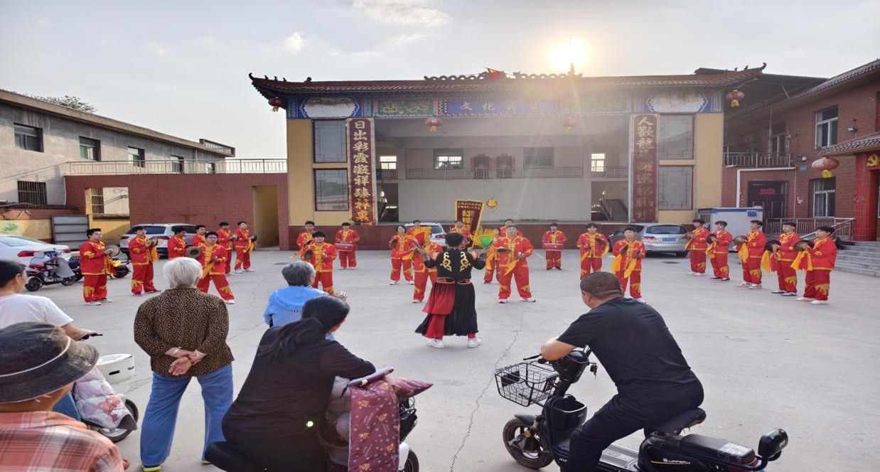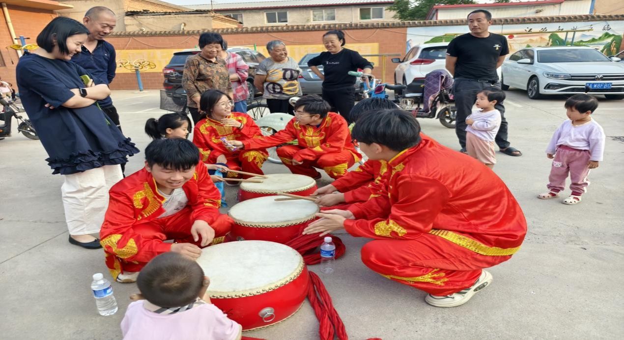 表演结束后,队员们主动邀请村里孩子体验锣鼓。他们手把手教孩子们握持小镲,从简单节奏开始练习。尽管孩子们敲出的节奏还稍显稚嫩,但专注的神情和欢快的笑声,传递出他们对锣鼓艺术的浓厚兴趣。在寓教于乐的氛围中,传统锣鼓文化的种子悄然播撒在孩子们心中。