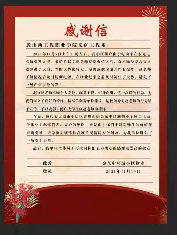 2021年11月5日,金东中环城小区租户由于电动车在家充电,不慎引起火灾,火势较大,室内浓烟滚滚并伴有爆炸声响,对住户造成重大危害,随时会引发严重事故。我系党员教师赵文艳老师发现火灾情况后,不顾个人安危冲入现场寻找灾情原因,及时切断电源,在物业公司人员赶到现场时,使用灭火器控制了火势,避免了一场严重事故的发生。11月10日,物业公司领导来到我系,赠送了锦旗和感谢信,表达对赵文艳老师的感谢。