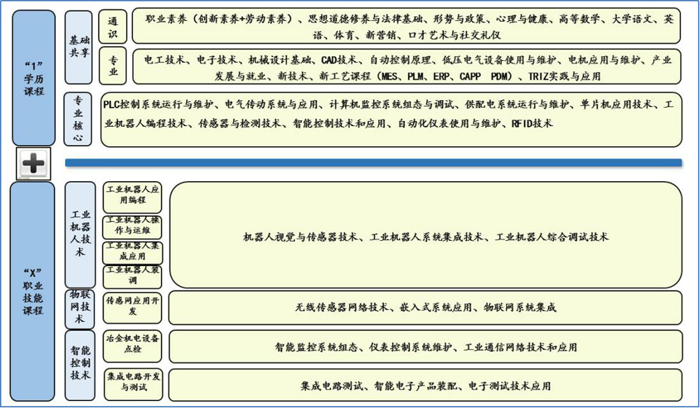 课程体系涵盖“1”学历证书课程和“X”职业技能证书课程。“1”学历证书课程包含基础共享课程和专业核心课程,其中基础共享课程中“通识”课程培养学生的社会能力,“专业”课程培养学生的基本专业素养;专业核心课程增强学生的专业知识应用能力。“X”职业技能证书课程分为“工业机器人技术”、“物联网技术”、“智能控制技术”三个方向,每个方向分别设置了3门课程。“X”职业技能证书课程的学习以创新协会为管理载体,是学生自主选择学习的课程。