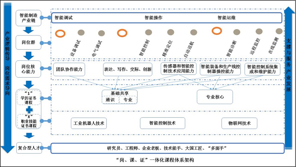 适应不同层次生源,打破专业壁垒,以职业技能为导向,以服务“1”与“X”的有机衔接为目标,针对自动化专业群所对应的智能装备制造产业链“调试”、“操作”及“运维”3个主要环节的岗位(电气调试、设备调试等8个岗位),分析岗位工作任务,提取岗位核心能力:即团队协作能力;表达、写作、交际、创新能力;传感器和智能控制技术应用能力;智能装备和生产线控制器操控能力;智能控制系统集成能力等。对应上述职业技能,自动化专业群构建了“岗、课、证”一体化的课程体系,全面培养学生的职业素养和职业核心技能。课程体系涵盖“1”学历课程和“X”职业技能课程。“1”学历课程包含基础共享课程和专业核心课程,其中基础共享课程中“通识”课程培养学生的社会能力,“专业”课程培养学生的基本专业素养;专业核心课程增强学生的专业知识应用能力。“X”职业技能课程分为“工业机器人技术”、“物联网技术”、“智能控制技术”三个方向。
