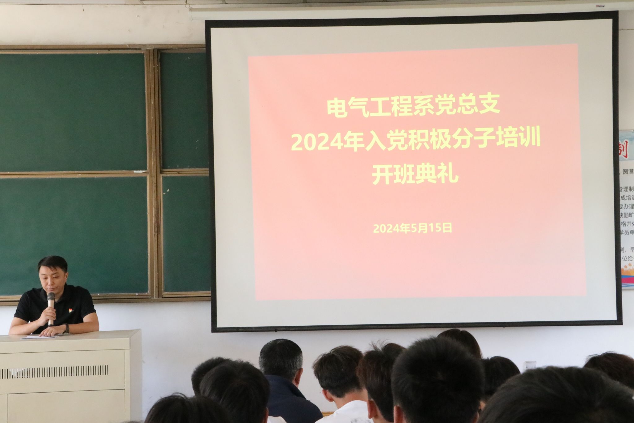 为深入贯彻落实新时代党的建设总要求和新时代党的组织路线,做好对入党积极分子的培养教育工作,5月15日,电气工程系于电教10举办了2024年入党积极分子培训开班典礼,系党总支学生党支部全体教师党员及2023年第二批和2024年第一批入党积极分子参加本次开班典礼。会议由系组织员李茜主持。