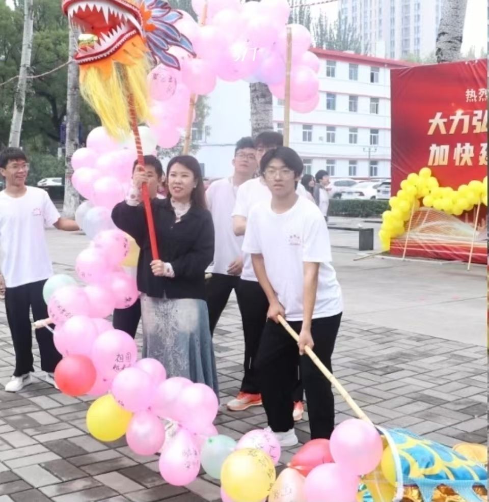 紧接着,舞龙社成员献上了精彩的舞龙表演,而那条由气球编织而成的巨龙也巧妙融入其中,尝试模仿舞龙的矫健身姿,为表演增添了一抹独特的创意与活力。这一融合,不仅让师生们亲身体验了非遗文化的魅力,更在欢声笑语中深刻表达了对祖国繁荣昌盛最真挚、最美好的祝愿。