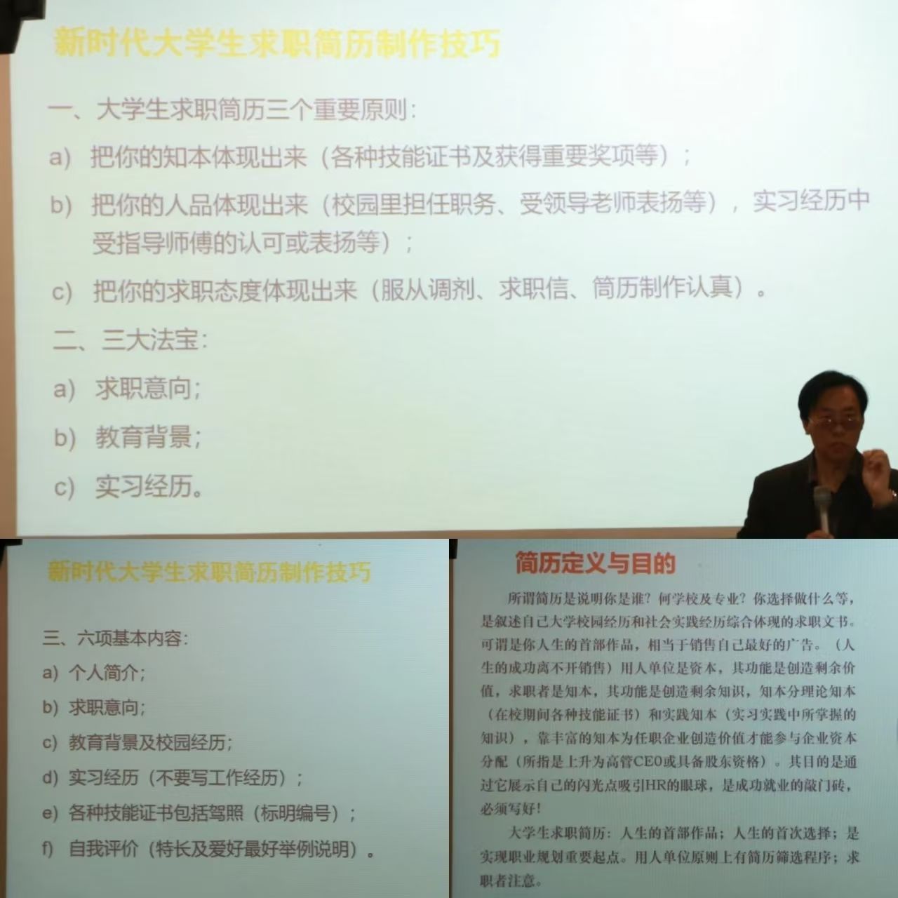 讲座中,王刚凭借多年从事大学生职业规划及就业指导教学的经验,结合电气系学子求职特点,强调了简历在大学生求职过程中的重要性。他从制作简历的目的、简历分类、大学生求职简历结构、怎么写求职简历、注意事项、简历对比六个方面进行了着重指导。