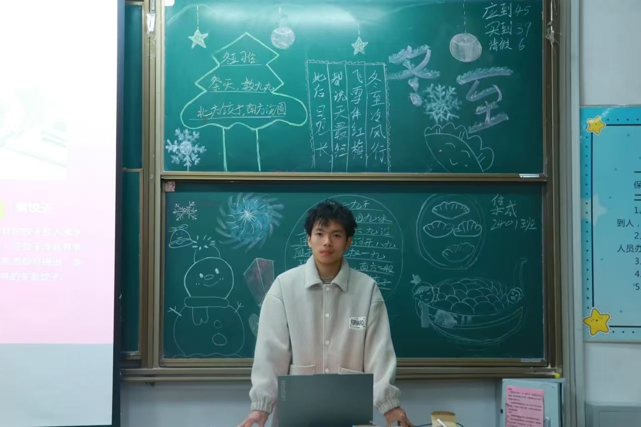 团课伊始,团课负责人通过PPT、视频等图文并茂的方式向同学们分享了冬至的起源、气候特征、以及古往今来冬至相关的诗词赏析,让大家走近冬至、认识冬至,帮助学生了解冬至的历史起源与传统习俗,引导学生深刻感受传统节日蕴藏的无穷魅力。随后负责人表示冬至已到、天气渐冷,每位同学都应该做好保暖,预防感冒。最后负责人讲解了“冬至到,吃水饺”的习俗以及冬至养生让同学们养成一个良好的健康身体。