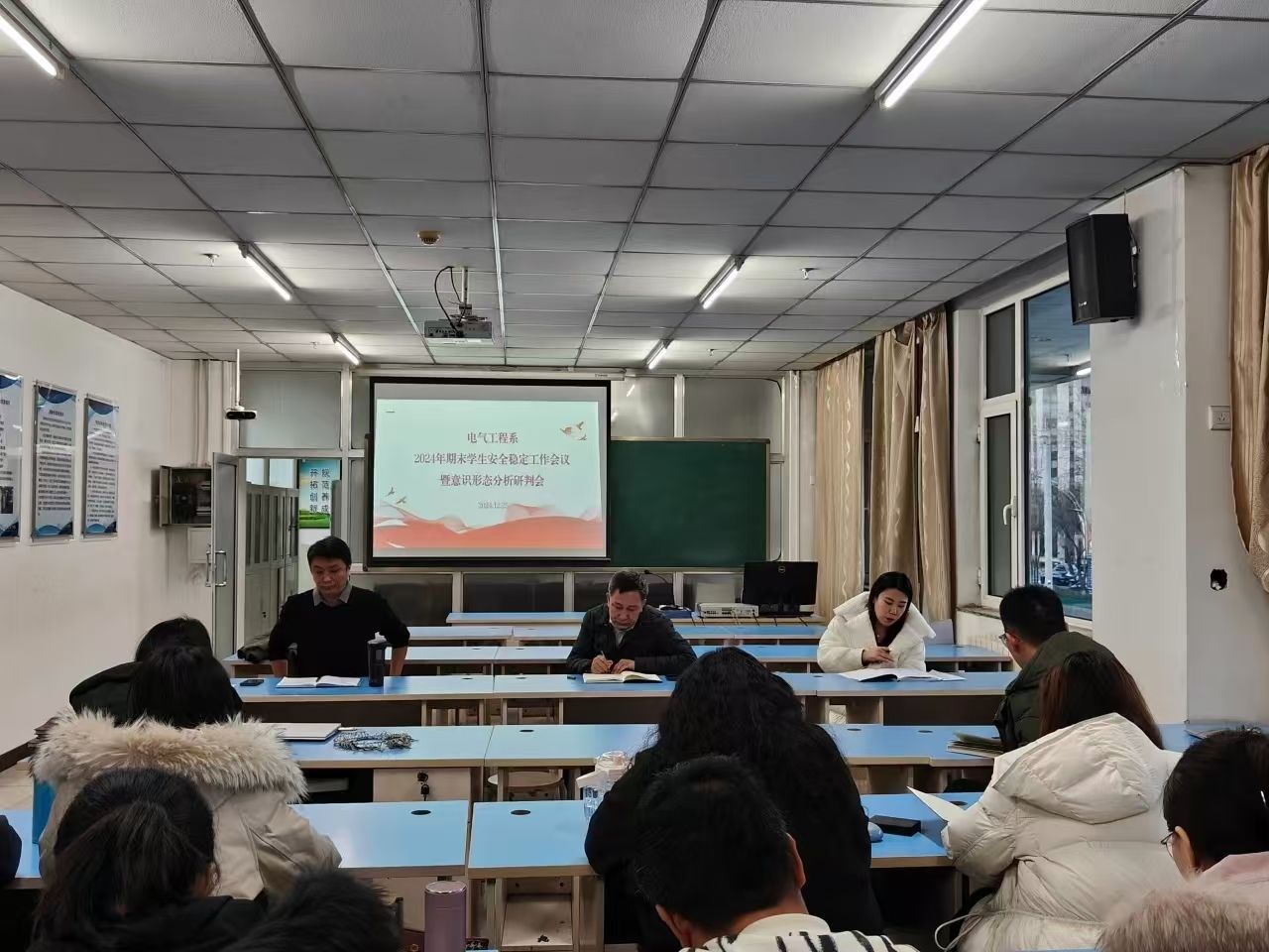 为确保期末学生安全稳定,加强意识形态工作,12月25日,电气工程系在行政楼二层供配电召开2024年期末学生安全稳定工作会议暨意识形态分析研判会。系全体教职工参加会。