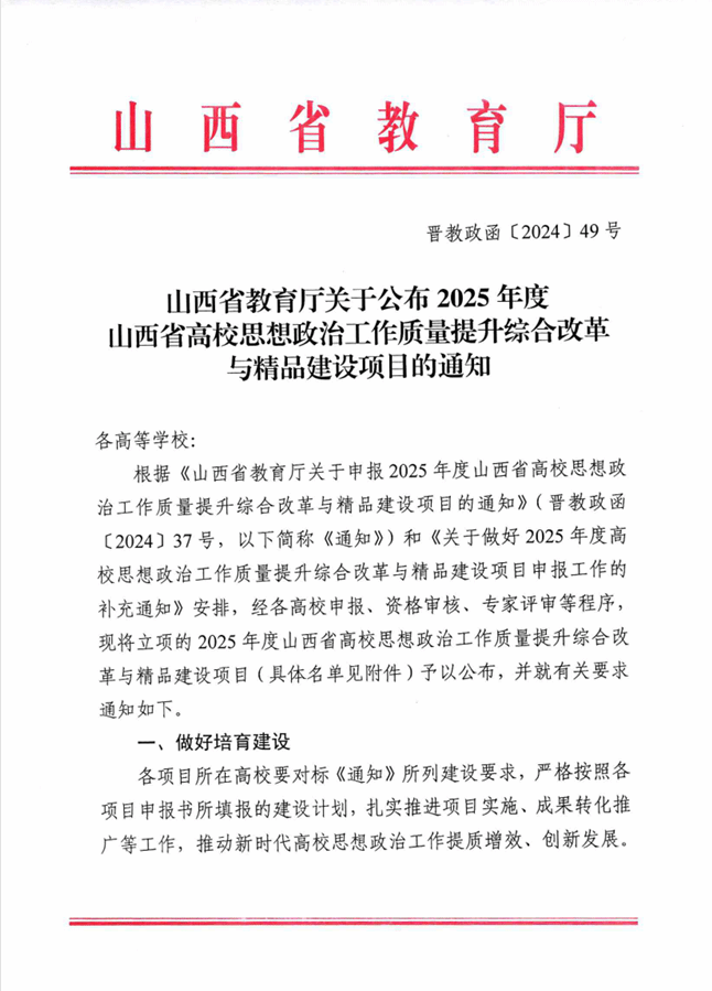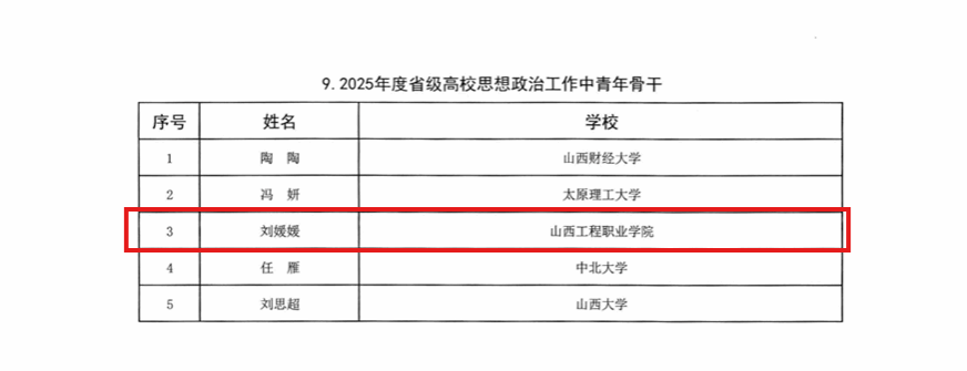 近日,山西省教育厅发文公布了2025年度山西省高校思想政治工作质量提升综合改革与精品建设项目评选结果,我系辅导员刘媛媛获评“2025年度省级高校思想政治工作中青年骨干”。