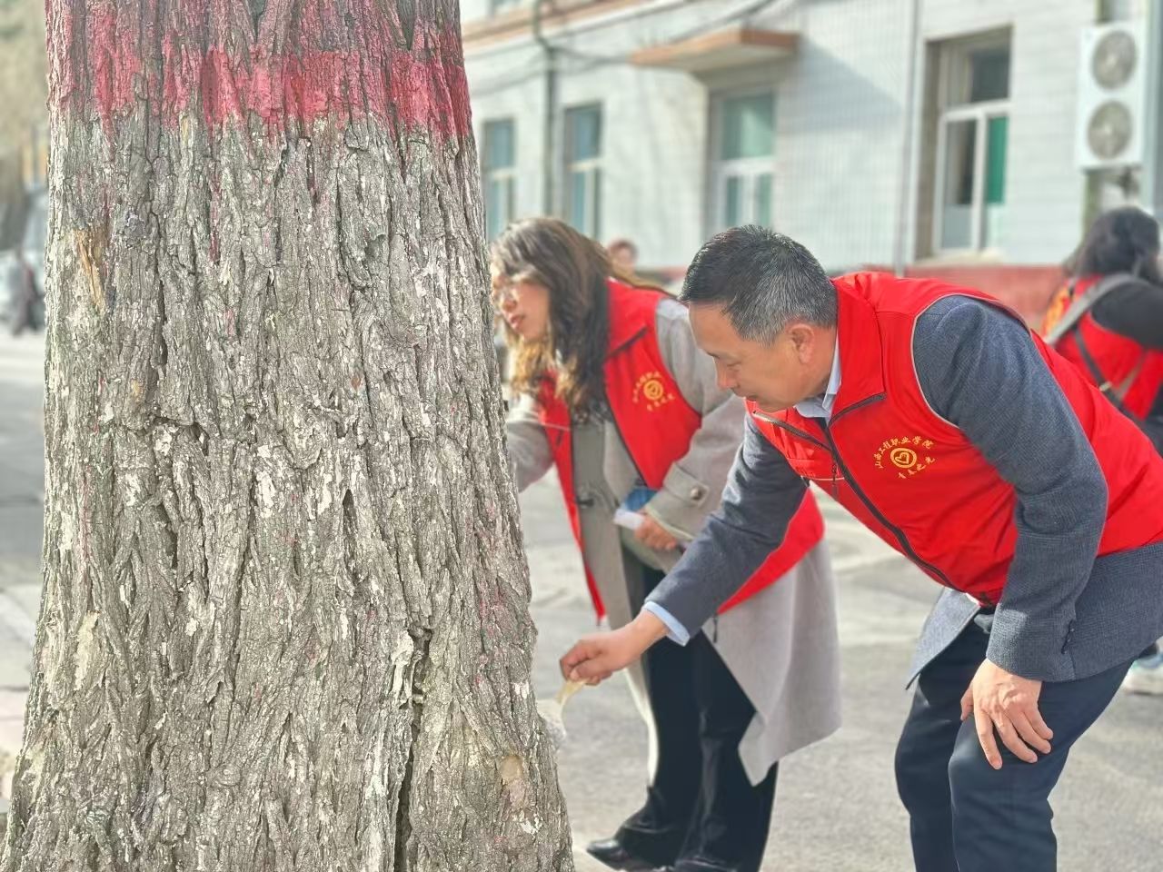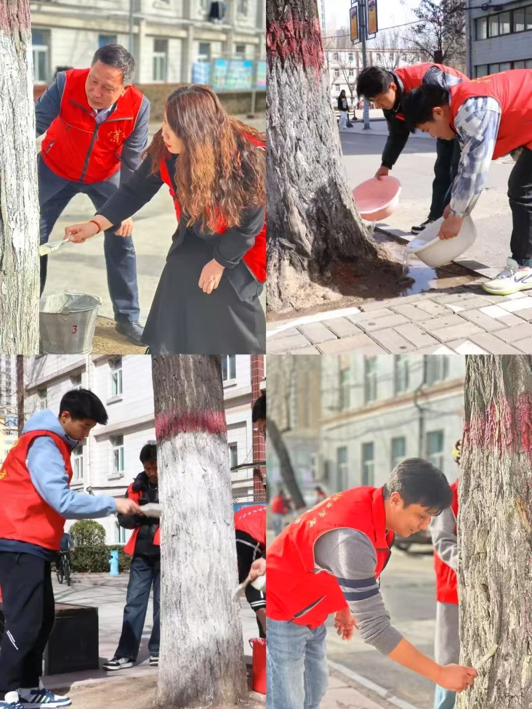 活动现场,师生们热情高涨,积极参与到植树护绿的各项任务中。浇水组的同学们手持水桶,细心浇灌,为每一棵树木送去生命的甘露;涂白组的师生们在物业工作人员指导下共同完成石灰浆后,认真地为树木涂上保护层,帮助它们抵御病虫害的侵袭。整个过程中,大家互相配合,井然有序,充分展现了师生的团结协作精神。