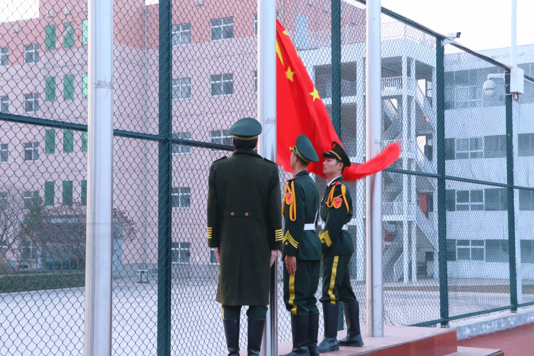 迎着初升的朝阳,国旗护卫队迈着铿锵有力的步伐护送国旗入场。在雄壮的《义勇军进行曲》中,鲜艳的五星红旗冉冉升起,全体师生肃立行注目礼,齐唱国歌,表达对祖国的崇高敬意。
