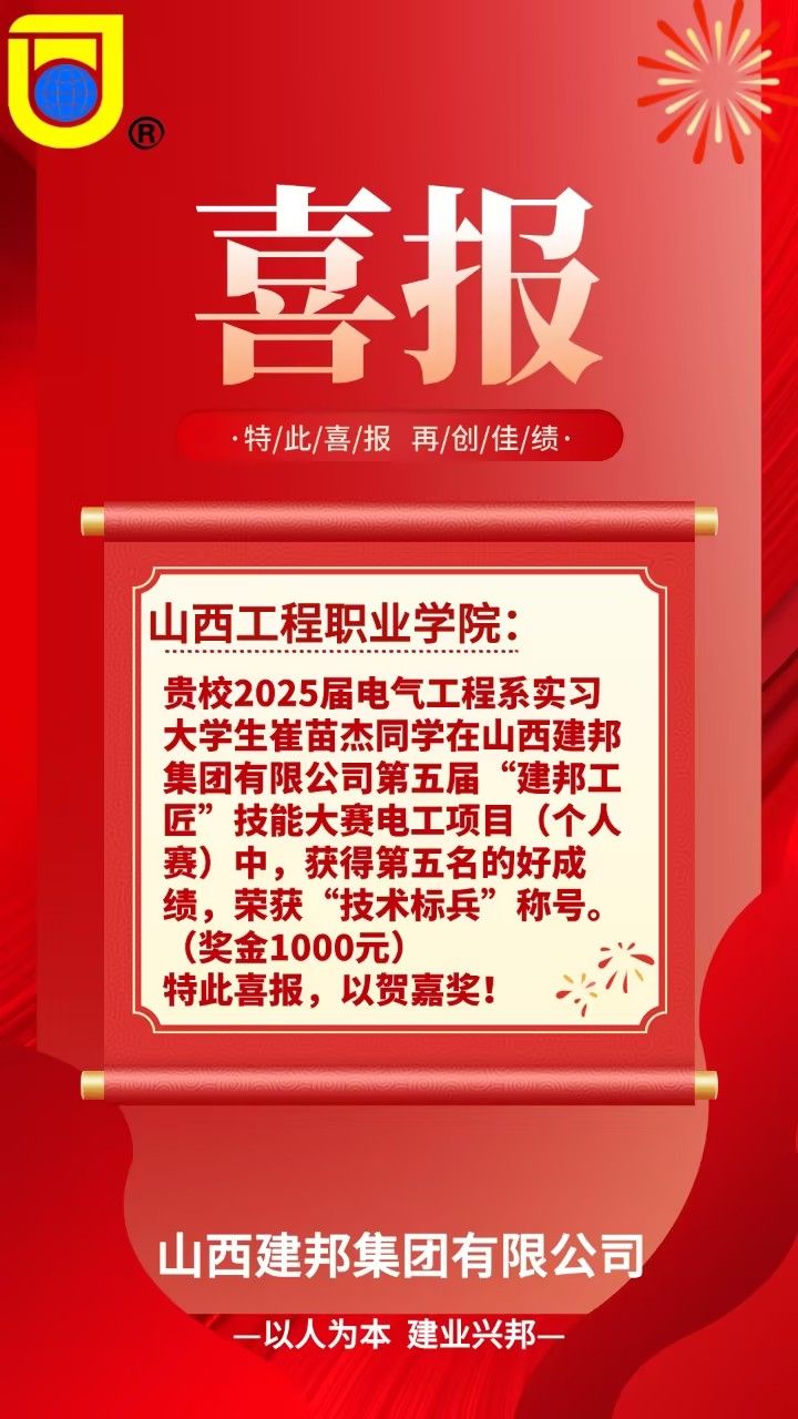 近日,电气工程系收到来自山西建邦集团有限公司的喜报,该校电气2207班实习学生崔苗杰在第五届“建邦工匠”技能大赛电工项目(个人赛)中表现优异,斩获第五名的佳绩,并被授予“技术标兵”荣誉称号。