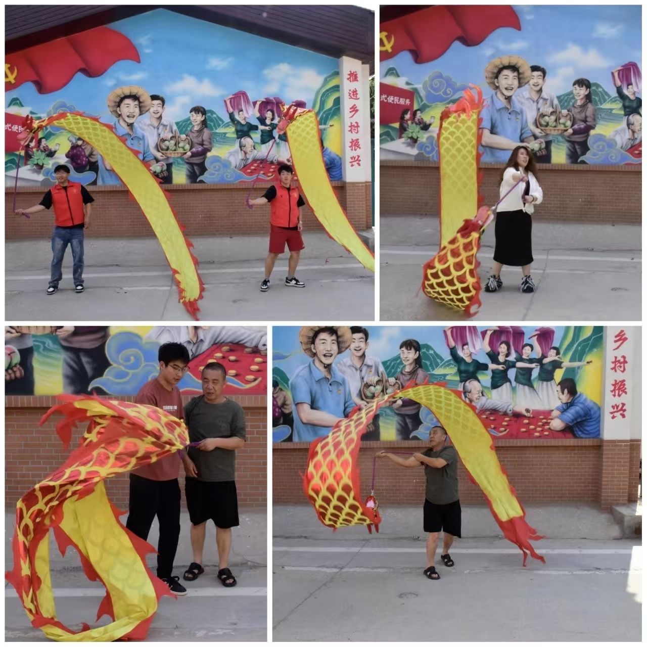 最后,实践团围绕非遗文化传承,向村民们介绍了舞龙文化的起源、发展以及其蕴含的中华民族团结向上的深刻内涵,实践队员吴凯,何源示范了彩带龙的基本动作,实现推动“非遗文化”进乡村。活动现场,西张耿村村民与实践团互动积极,反应热烈。