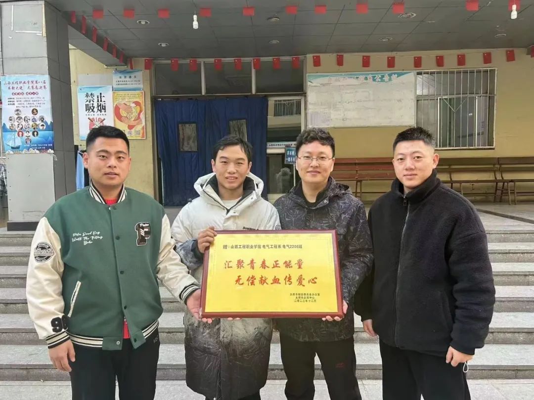 面对同学们自发的献血行为,太原血液中心为电气2206班赠予了“汇聚青春正能量,无偿献血传爱心”牌匾。