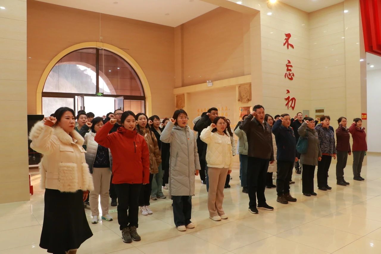 进入高君宇纪念馆,氛围庄严而肃穆。面对鲜红的党旗,全体党员紧握右拳重温入党誓词。