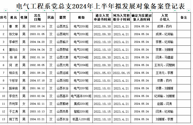经学生党支部培养教育和考察,在征求培养联系人、党员和教师意见的基础上,经支部委员会讨论同意并报学院党委备案,曹席等13名被列为拟发展对象。根据发展党员工作有关要求,现将有关情况公示如下。