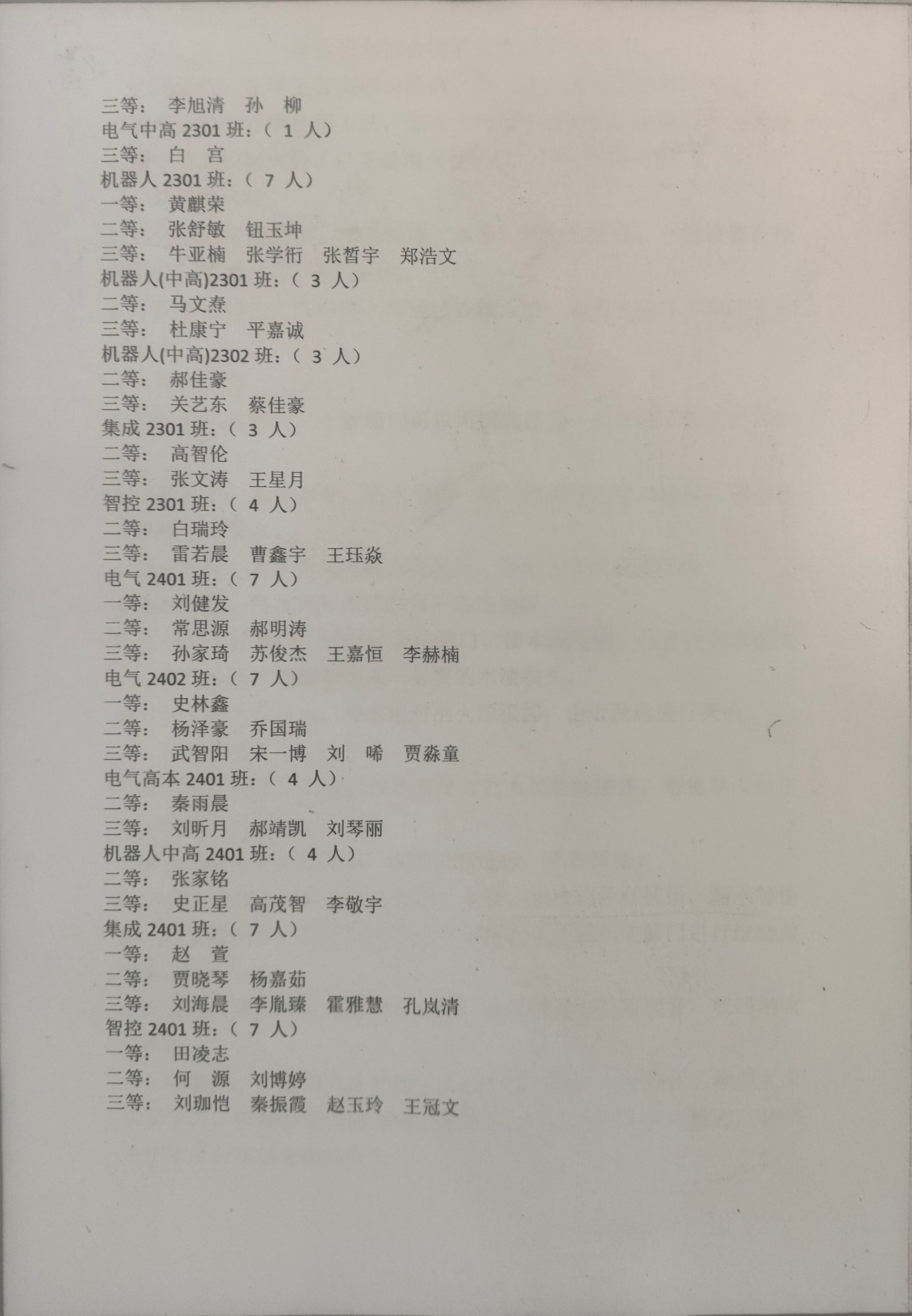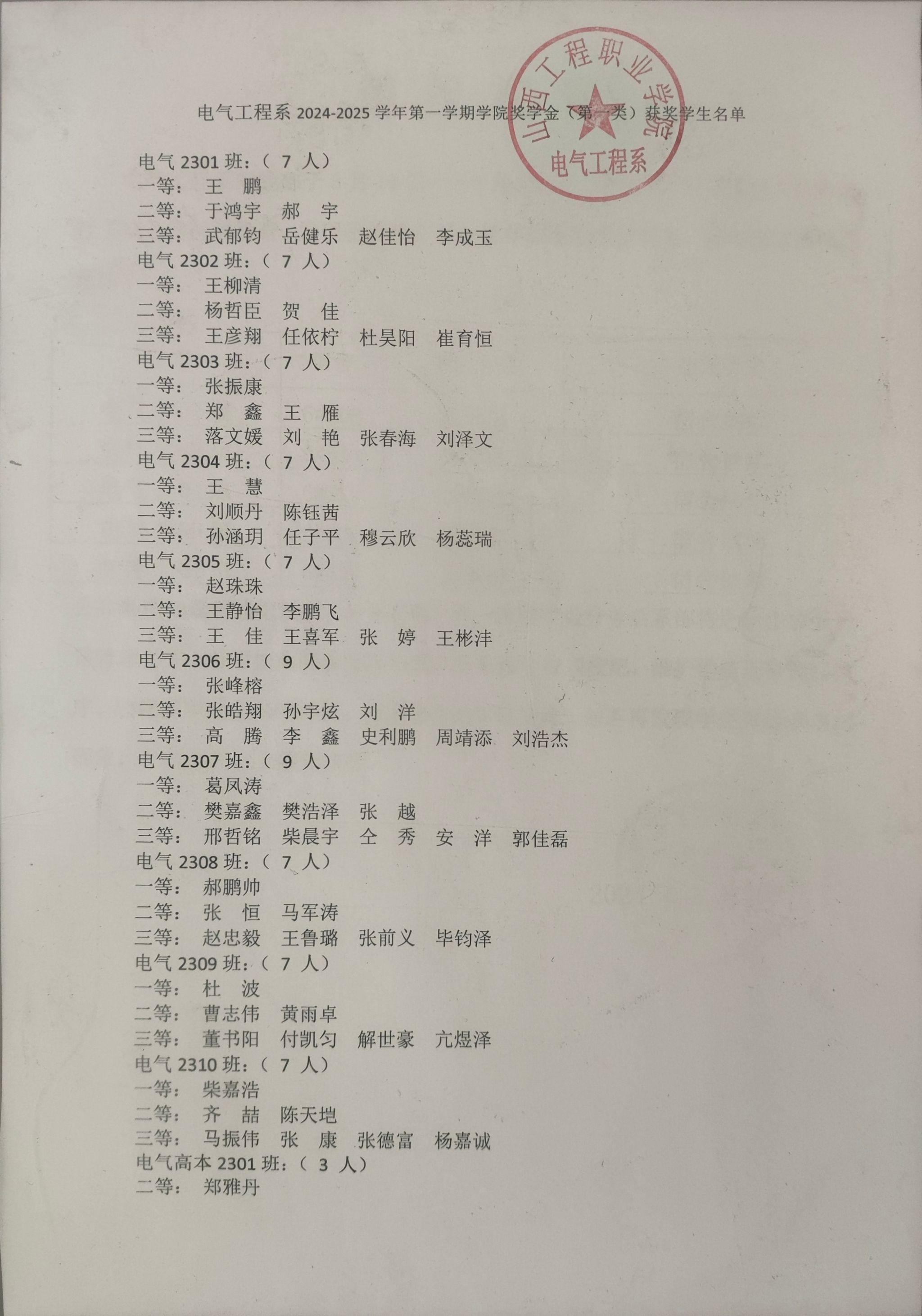 电气工程系2024-2025学年第一学期学院奖学金(第一类)获奖学生名单