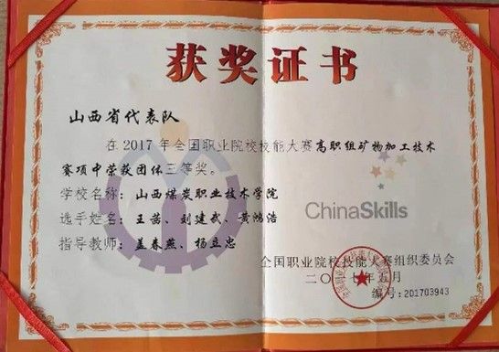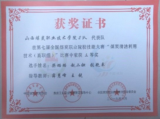 获奖情况:近年来煤清洁利用技术专业学生获得全国煤炭职业院校技能大赛“煤炭清洁利用技术”国赛三等奖2项;获得全国职业院校技能大赛高职组矿物加工技术赛项团体一等奖1项、三等奖1项。