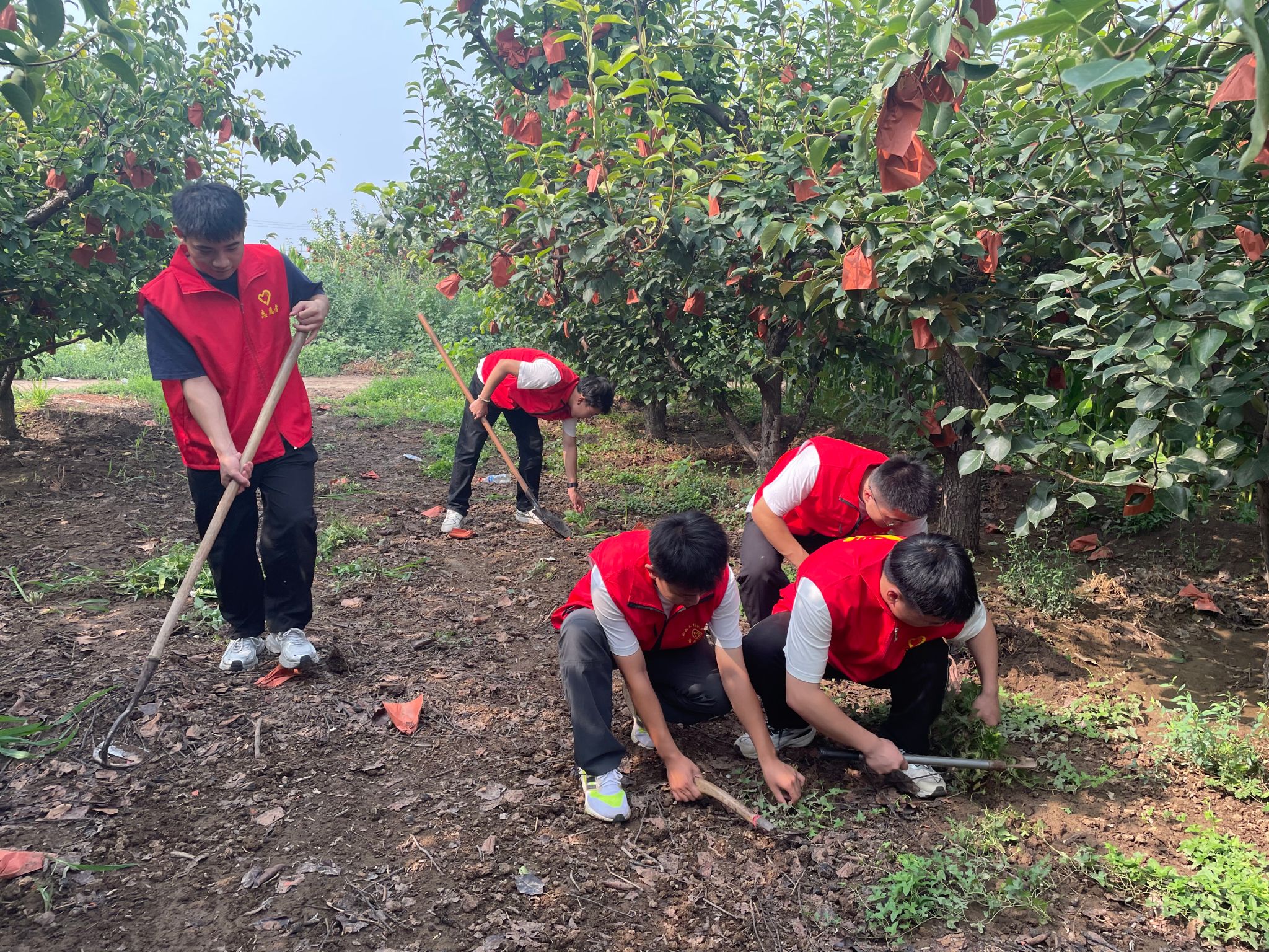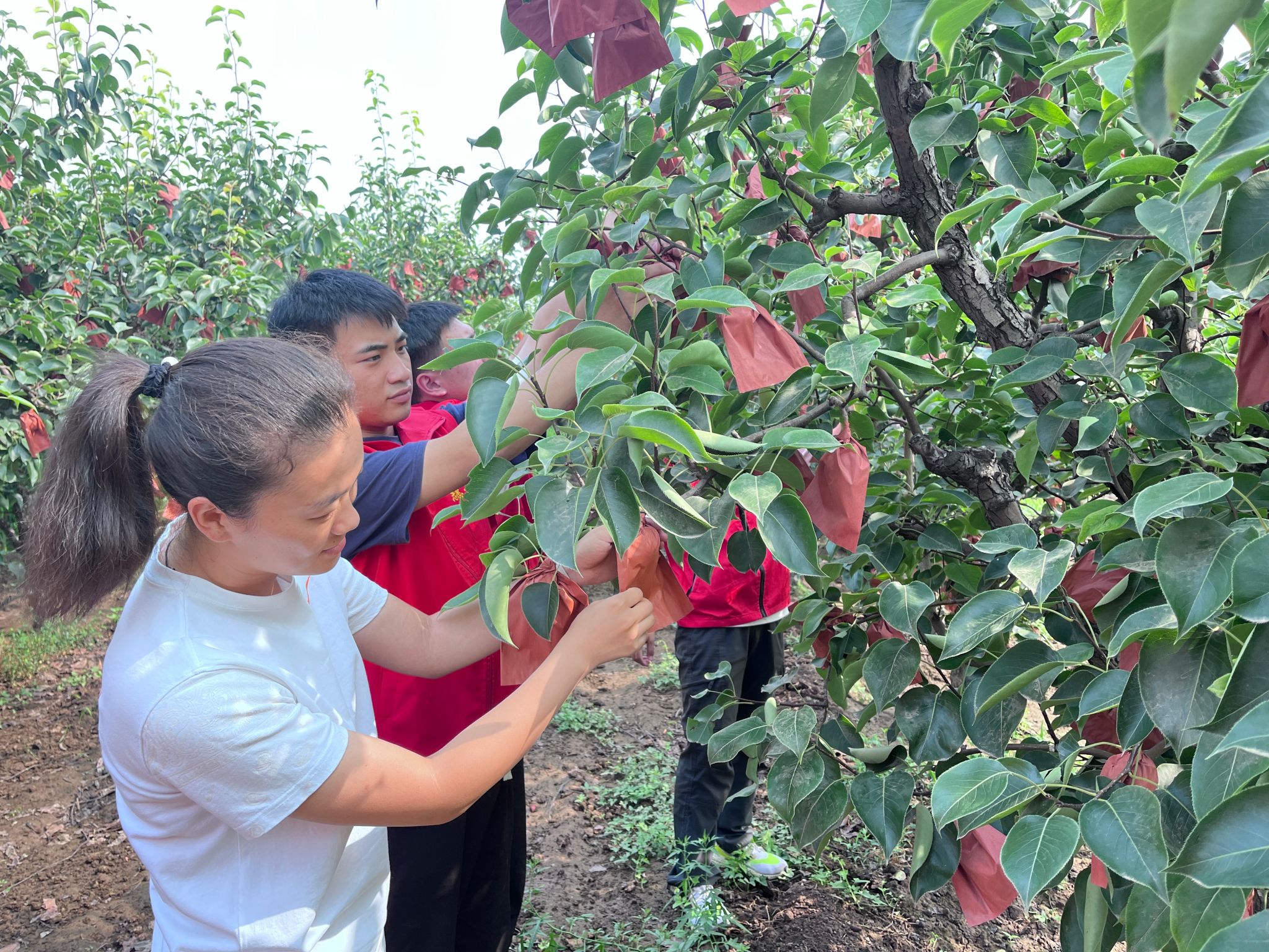 在农业工作者的讲解和指导下,社会实践队成功为梨树套上保护套,帮助完成了梨树地除草任务,用劳动和汗水助力当地的乡村振兴工作。