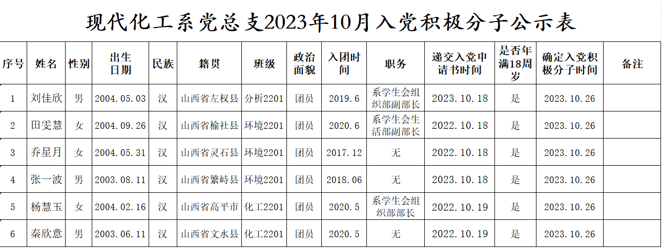 经团组织推优和党员推荐,2023年10月26日,现代化工系学生党支部召开支委会,确定刘佳欣等6名同志为入党积极分子。现将有关情况公示如下(见下表)。