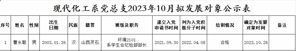 经党支部培养教育和考察,曹永聪同志已基本具备党员条件,在听取培养联系人意见、综合量化考核等基础上,2023年10月26日,现代化工系学生党支部召开支委会,讨论确定曹永聪同志为拟发展对象。根据发展党员工作要求,现将有关情况公示如下。