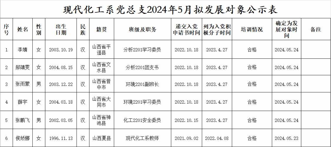 经党支部培养教育和考察,李婧等6名同志已基本具备党员条件,在听取培养联系人意见、综合量化考核等基础上,2024年5月23日教师党支部召开支委会,同意确定侯娇娜同志为拟发展对象,2024年5月24日学生党支部召开支委会,同意确定李婧等5名同志为拟发展对象。根据发展党员工作要求,现将有关情况公示如下。