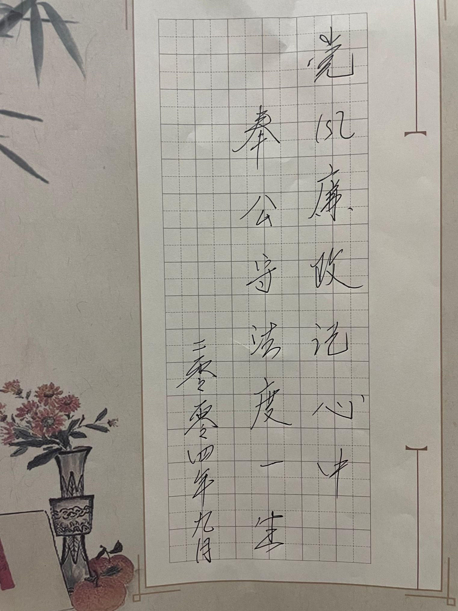 在新时代背景下,加强党风廉政建设,提升党员干部的廉洁自律意识,是推进全面从严治党向纵深发展的必然要求。为弘扬中华优秀传统文化,强化廉政意识,9月25日,现代化工系党总支特举办“清风扬正气,笔墨书廉洁”主题党日活动。