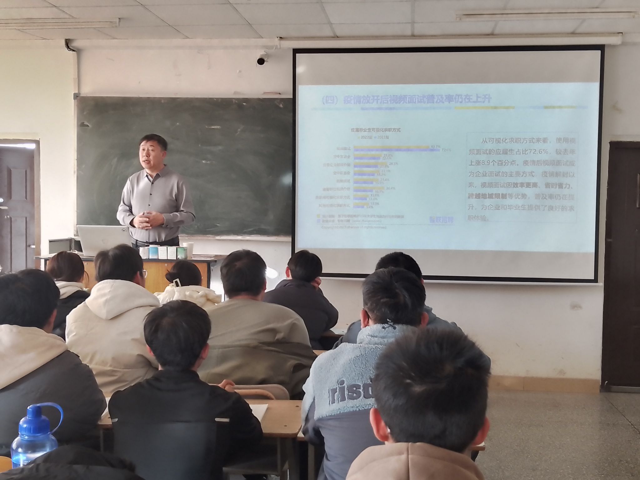 徐洪波通过教学,引导同学们结合国内外客观条件的变化,科学理性看待当前“就业难”问题,对就业形势保持清醒和冷静,并勉励同学们要保持平实之心,客观看待个人条件和社会需求,结合国家长期发展大势,从实际出发选择职业和工作岗位,让美好青春在祖国最需要的地方奋斗、绽放。