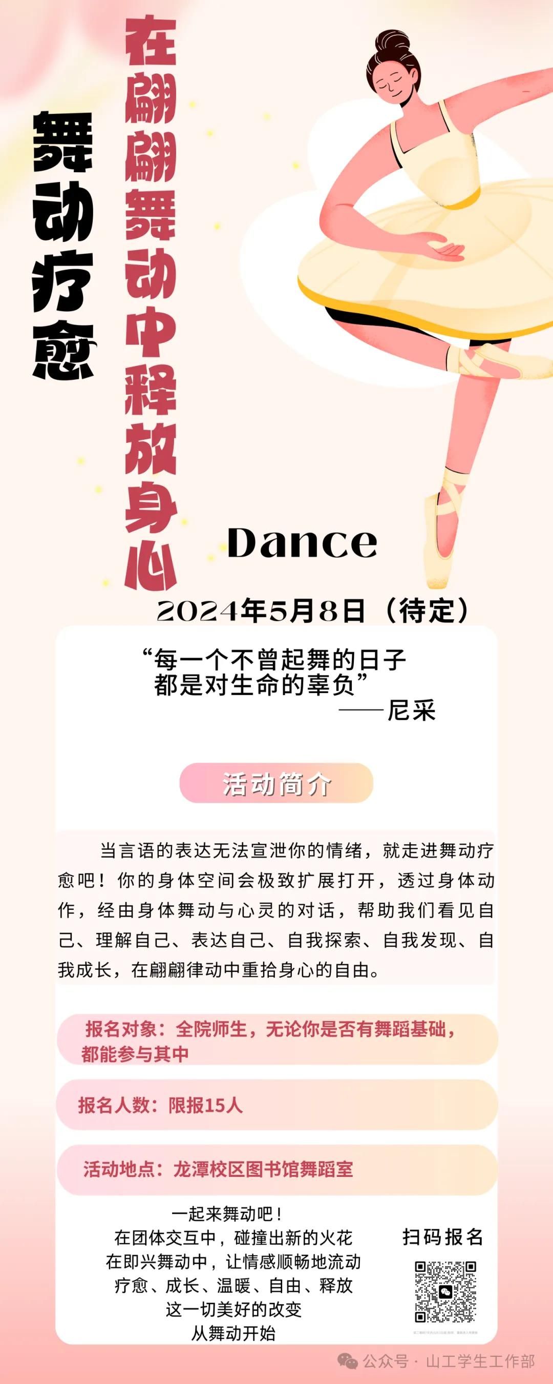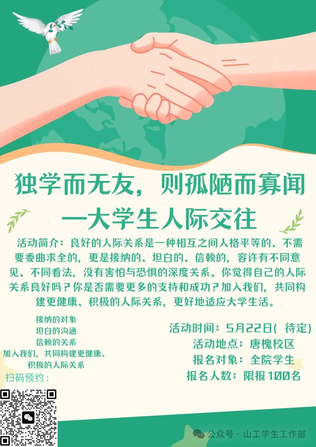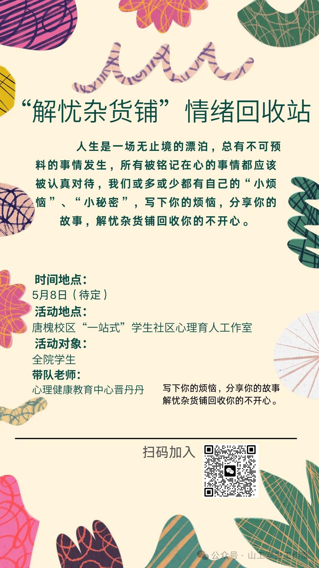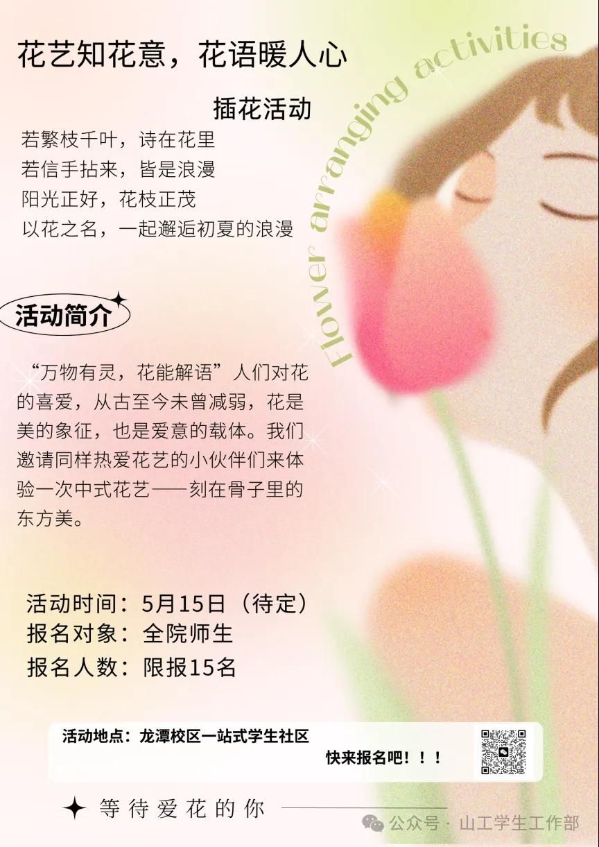 草长莺飞,丝绦拂堤。“一站式”学生社区“5.25”心理健康月系列活动即将来临,我们有健心运动,美育浸润,讲座科普,心理团辅,手工实践五大类共计10项精彩纷呈的活动,你准备好了吗?请扫码预约来一场随心而欲的约会吧!
