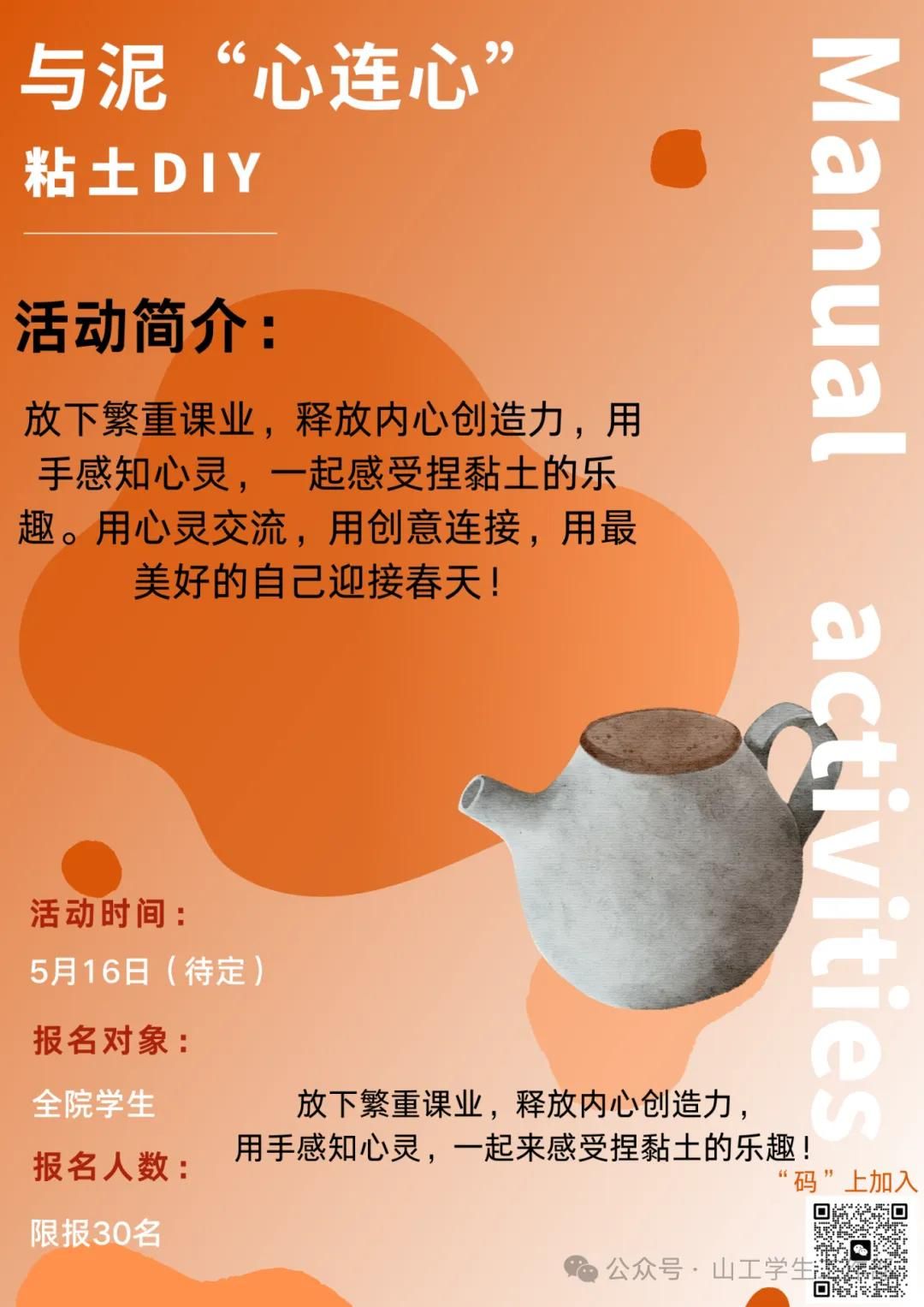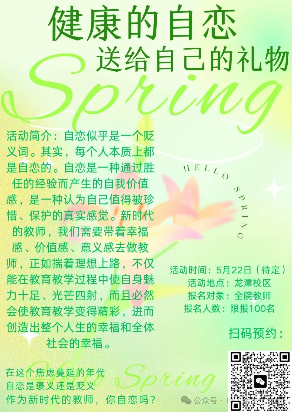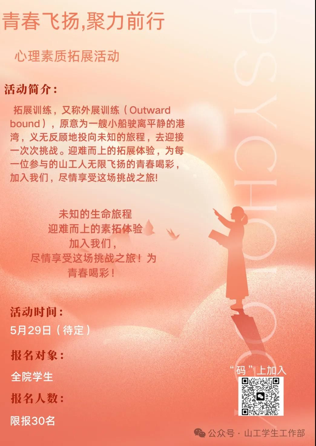 草长莺飞,丝绦拂堤。“一站式”学生社区“5.25”心理健康月系列活动即将来临,我们有健心运动,美育浸润,讲座科普,心理团辅,手工实践五大类共计10项精彩纷呈的活动,你准备好了吗?请扫码预约来一场随心而欲的约会吧!