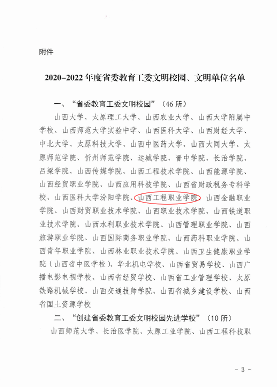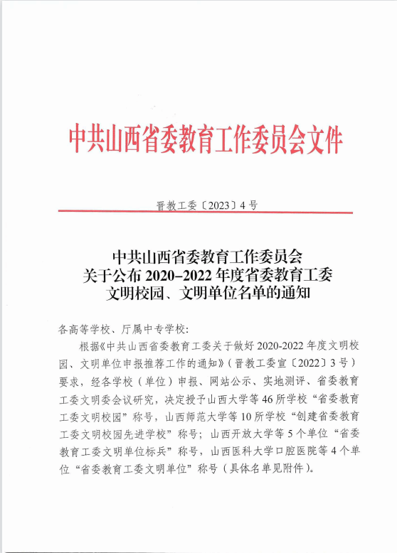 9月21日,山西省委教育工委下发文件,公布2020-2022年度省委教育工委文明校园、文明单位名单,时博备用网址荣获“省委教育工委文明校园”称号。