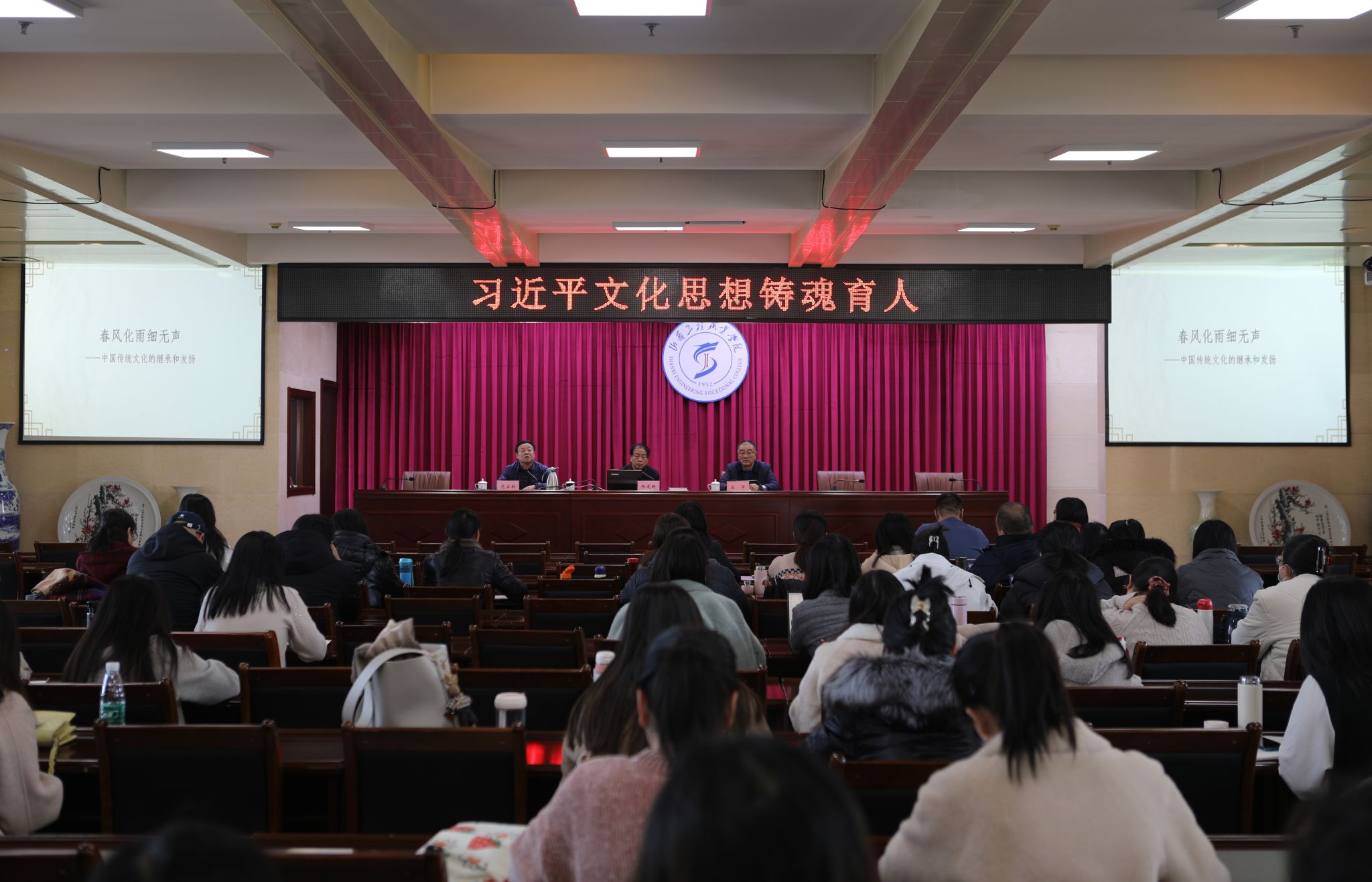 为深入学习贯彻习近平文化思想,充分发挥习近平文化思想培根铸魂、启智润心、立德树人、凝心聚力的重要作用,11月17日下午,唐槐人文讲堂特邀杨建新总经理作了题为《春风化雨细无声》的专题讲座。本次讲座由思政部、学工部、宣传部联合主办,思政部主任范安新主持,院长宋军出席,全体思政课教师及辅导员参加。