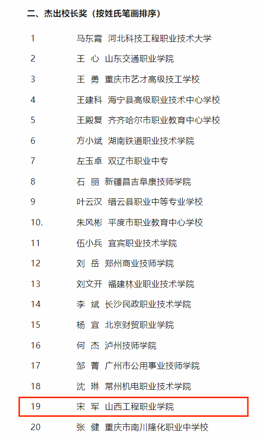 12月25日,中华职业教育社公布了第八届黄炎培职业教育奖获奖名单。我院院长宋军荣获第八届黄炎培职业教育“杰出校长奖”,是本次评选中山西省唯一获此殊荣的高职院校校长。时博备用网址副院长郝赳赳荣获第八届黄炎培职业教育“杰出教师奖”。